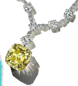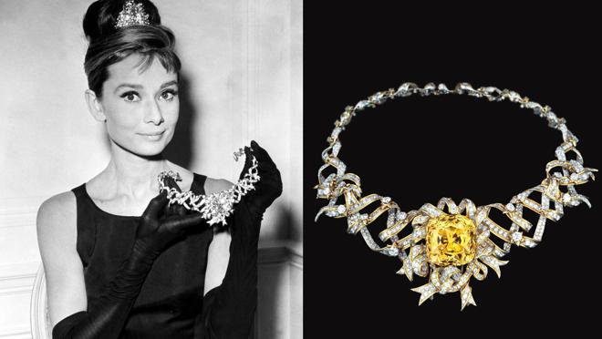 El diamante amarillo que la adornó fue descubierto por el fundador de Tiffany & Co., en 1877 en las minas Kimberley o Big Hole de Sudáfrica, y es considerada como una de las excavaciones a mano más grandes del planeta. Luego se popularizó después de que una de las estrellas más clásicas del cine, Audrey Hepburn lo luciera en varias de las imágenes promocionales de la película Desayuno con diamantes.