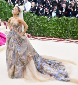 Ariana Grande fue una de las más esperadas de toda la noche y sin renunciar a sus inseparables orejitas, pisó la alfombra roja con un vestido estampado con pinturas clásicas firmado por Vera Wang