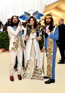Lana del Rey y Jared Leto con un estilo “Jesus”. Ambos llevaron GUCCI y fueron acompañados por Alessandro Michele el diseñador de la marca. Bautizados los tres como la Santísima Trinidad de la Met gala 2018. Lana del Rey escogió “un traje de noche de color marfil, manga larga, en seda cady y encaje inspirado en Nuestra Señora de los Dolores”, tal y como detalla la firma italiana.