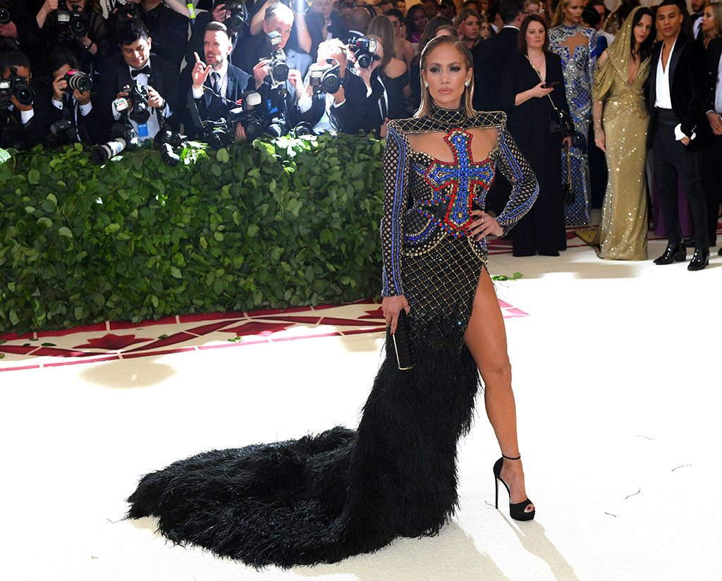 Jennifer López siempre da de qué hablar con sus Looks pero en esta Met Gala fue a mi parecer la más hermosa porque supo mezclar sobriedad, elegancia, temática y sensualidad. Llevó uno de mis diseñadores preferidos Olivier Rousteing para “Balmain” con un vestido de manga larga de rejilla, transparencias en el escote con una cruz bordada y una preciosa falda de plumas negras acompañada de una abertura de vértigo. Un vestido que después de la gala se va a subastar con un precio de salida de 5000 dólares. ¡Simplemente perfecta!