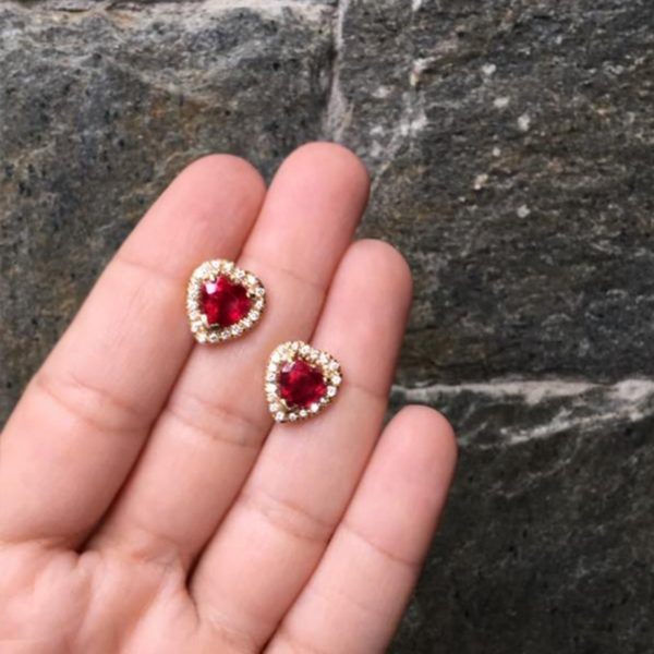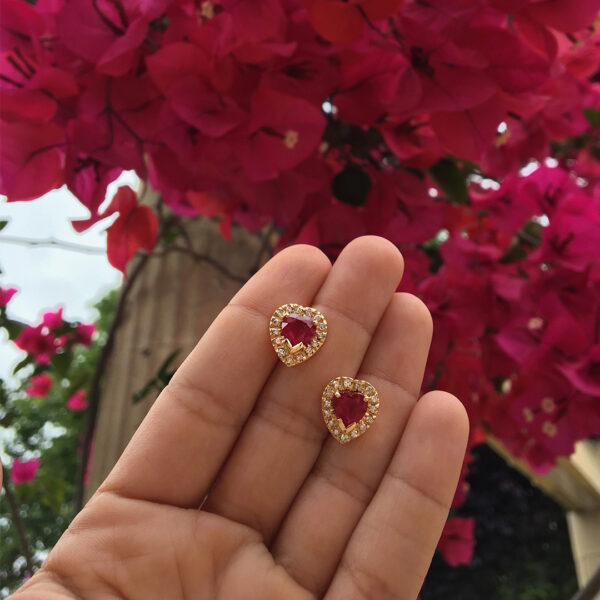 18K Gold Earrings Ruby in Heart Shape + White Diamonds Round Cut. Available in Gold, White and Rose.